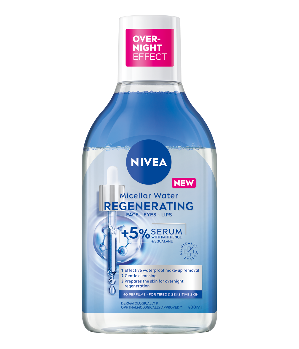 Apa micelara regeneratoare Nivea, cu aminoacizi, 5% pantenol si scualan, curata machiajul rezistent si sustine regenerarea pielii sensibile pe timpul noptii.