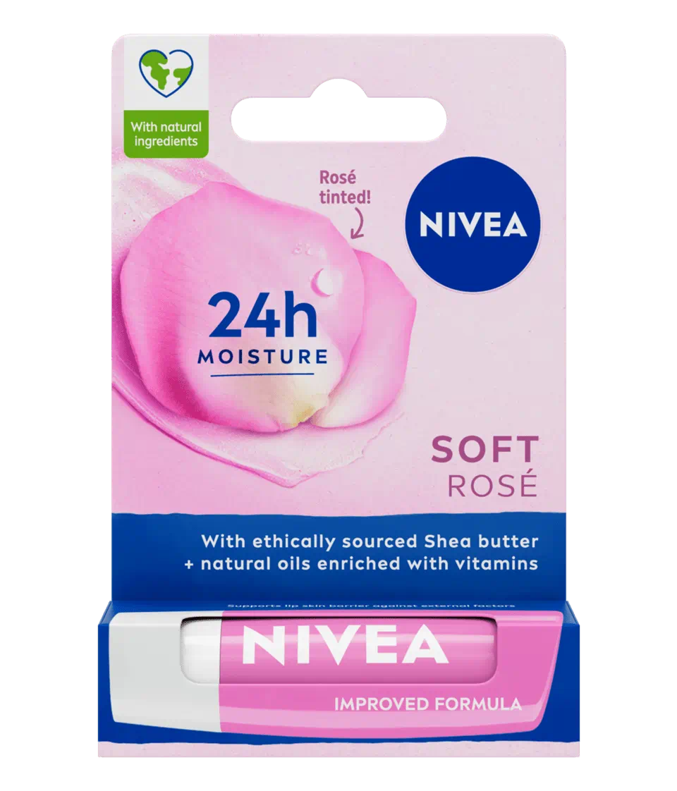 Balsam de buze Nivea Rose 4.8g, cu nuanta roz delicata si hidratare 24h, fara uleiuri minerale.