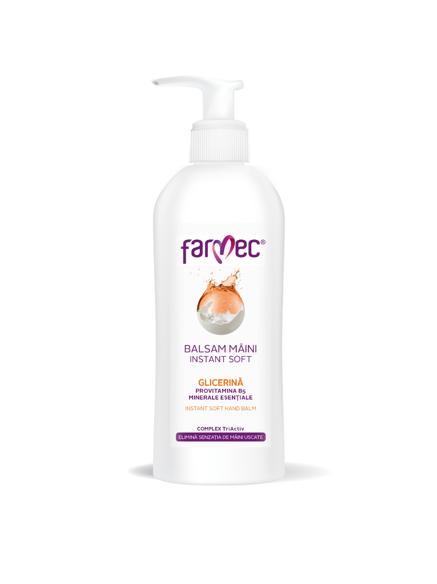 Farmec Balsam de Mâini Instant Soft este recomandat a se folosi după fiecare spălare pe mâini. Balsamul se absoarbe ușor și acționează rapid pentru refacerea barierei hidro-lipidice a pielii mâinilor, afectată de factorii de mediu, de spălări și dezinfectări frecvente....