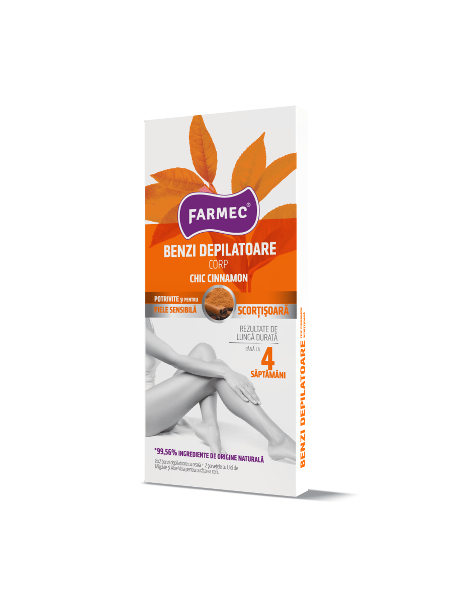 Farmec Benzi depilatoare pentru corp cu scorțișoară, îndepărtează eficient părul nedorit şi vă lasă pielea hidratată. Conţin 99,56% ingrediente de origine naturală. Șervețele pentru curățarea cerii conțin ulei de migdale și aloe vera. Îndepărtează orice reziduu de ceară, iar pielea ramâne curată și catifelată....