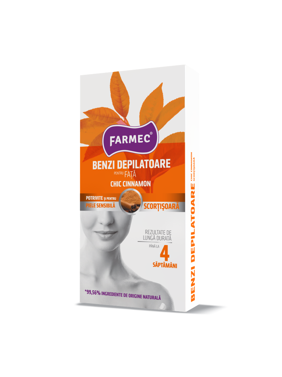Farmec Benzi Depilatoare pentru Față cu Scorțișoară îndepărtează eficient părul nedorit deasupra buzei superioare, bărbie sau gât şi vă lasă pielea catifelată. Șervețele pentru curățarea cerii conțin ulei de migdale și aloe vera. Îndepărtează orice reziduu de ceară, iar pielea ramâne curată și catifelată....