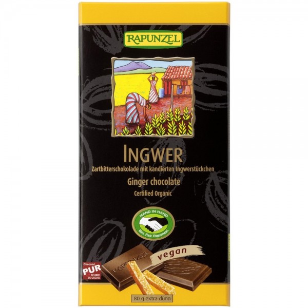 Ciocolata bio cu ghimbir este o ciocolata amaruie fina. Bucatelele de ghimbir zaharate si tocate ii confera o aroma calda, usor iute si intensa.