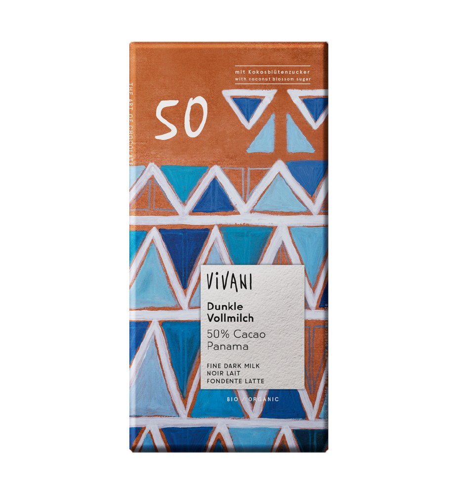 Ciocolata bio Vivani cu 50% cacao din Panama si cu zahar din flori de cocos. Continut ridicat de cacao si dulceata subtila, o compozitie pentru iubitorii de lapte integral si ciocolata neagra deopotriva.