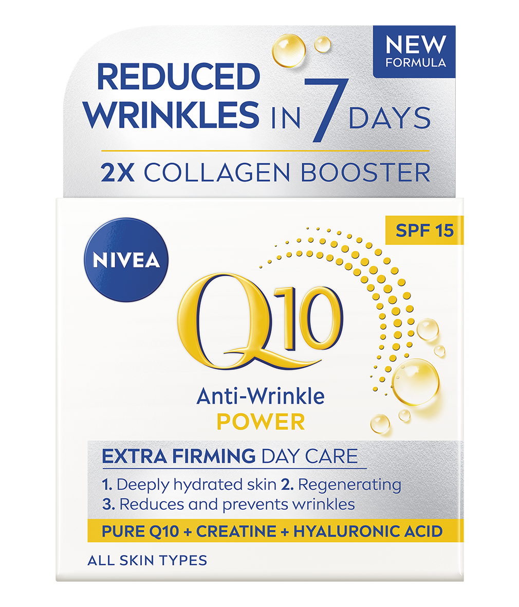 Crema de zi Nivea Q10 cu SPF15 hidrateaza intens, sustine fermitatea si reduce ridurile datorita complexului Q10 pur, creatinei si acidului hialuronic.