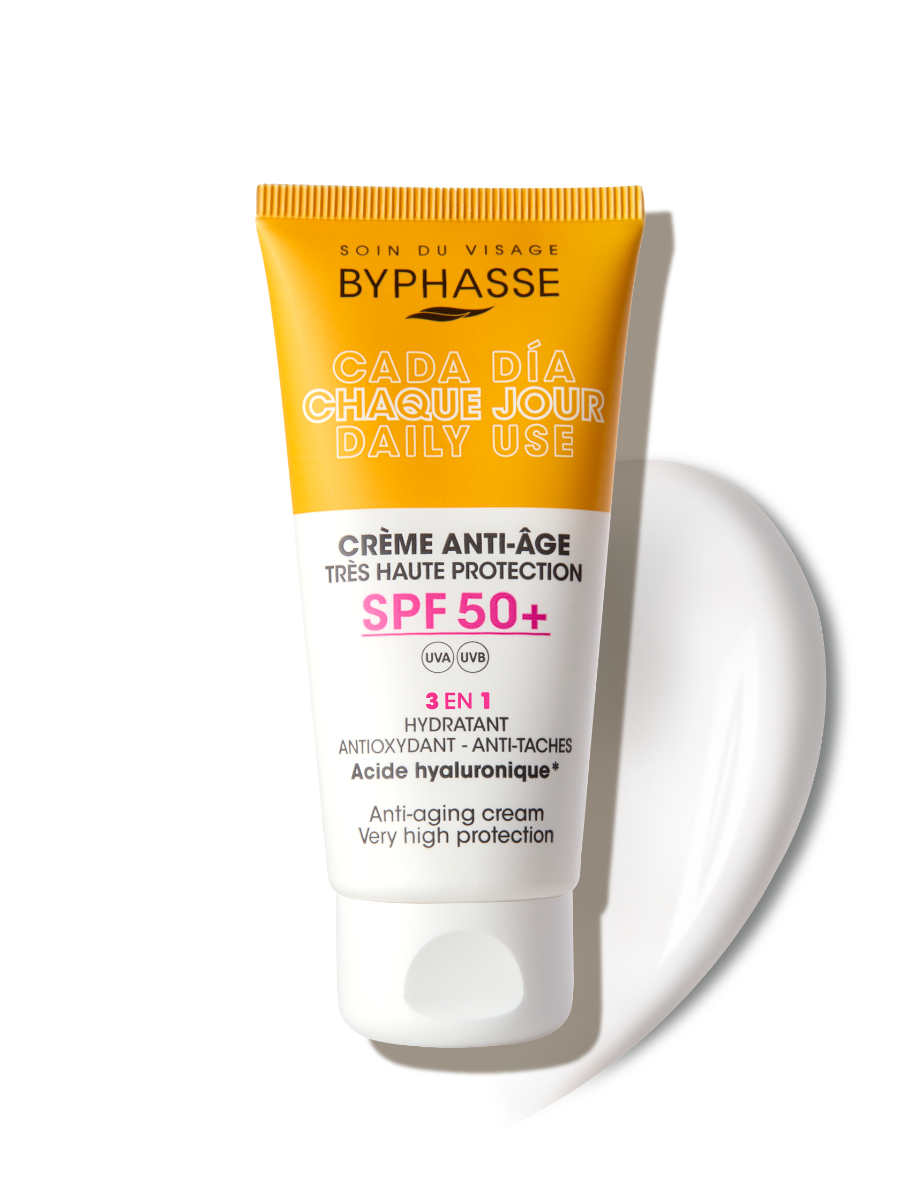Crema antirid de zi Byphasse cu SPF50+ protejeaza impotriva razelor UVA/UVB, hidrateaza intens si previne imbatranirea prematura a pielii datorita acidului hialuronic si vitaminei E.