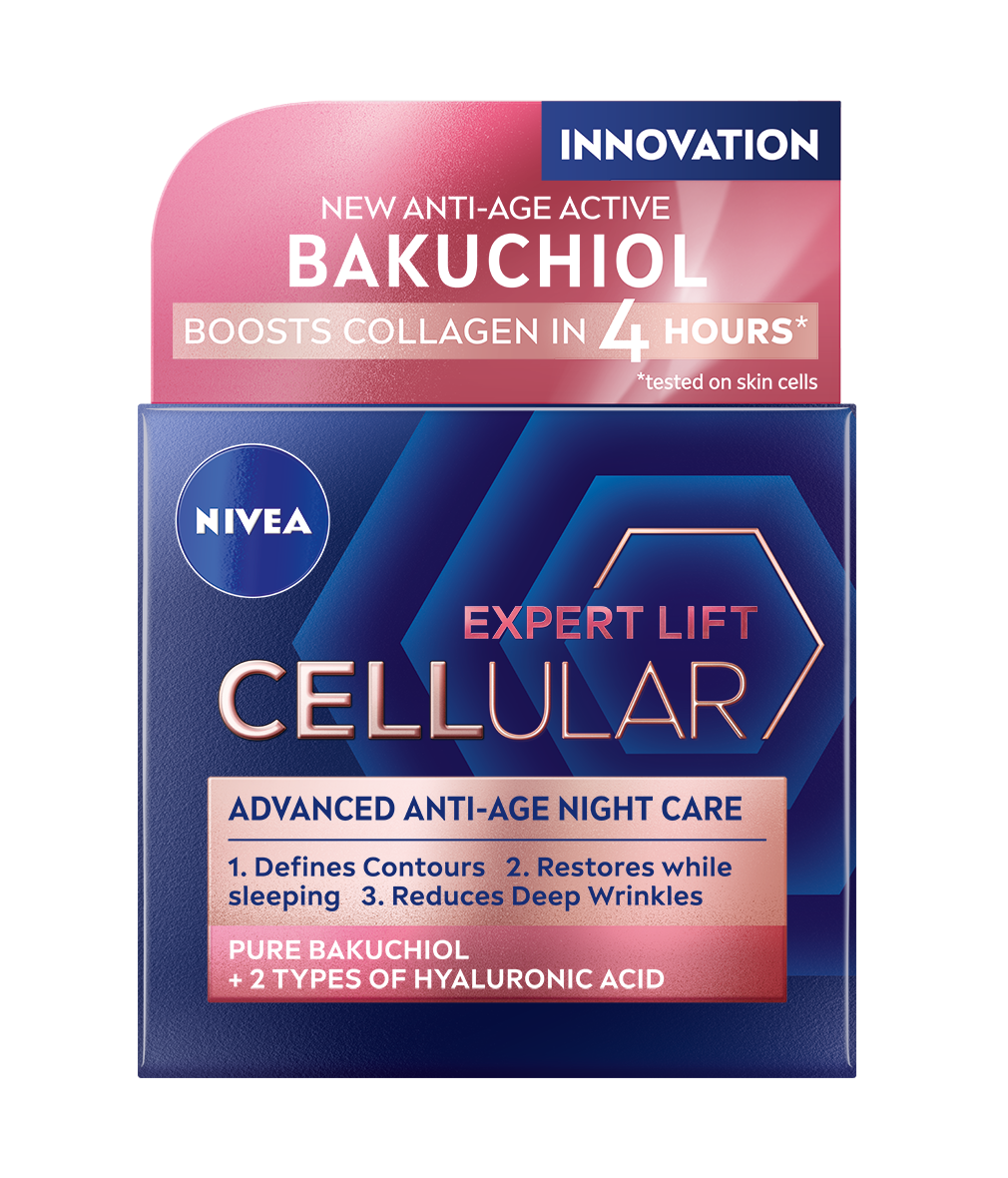 Crema de noapte Nivea Cellular Elasticity cu bakuchiol pur si acid hialuronic hidrateaza intens, netezeste ridurile si redensifica pielea peste noapte.