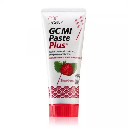 Cremă dentară topică Mi Paste Plus cu aromă de căpșuni, 40 g, GC Descriere: Mi Paste Plus este o cremă dentară remineralizantă pe bază de apă, fără zahăr, formulată cu RECALDENT CPP-ACP (fosfopeptidă caseină - fosfat amorf de calciu) și fluor (900 ppm). Acest produs este destinat protecției și refacerii smalțului dentar, fiind ideal pentru pacienții cu risc crescut de carii, eroziuni dentare sau alte afecțiuni orale. Cu un gust plăcut de căpșuni, această cremă este potrivită pentru toate categoriile de utilizatori. Indicații: Pacienți cu carii agresive sau pierderi de țesuturi dure prin eroziuni sau abraziuni dentare accelerate. Persoane aflate sub tratament radioterapeutic în zona capului și gâtului. Femei însărcinate. În timpul și după tratamentele ortodontice. Pacienți cu aciditate orală accentuată sau reflux gastric. Persoane cu dificultăți de control al plăcii bacteriene și cu risc crescut de carii. Beneficii cheie: Neutralizează pH-ul plăcii bacteriene: contribuie la reducerea riscului de carii prin menținerea unui mediu oral sănătos. Previne adeziunea bacteriană: împiedică dezvoltarea streptococilor responsabili de apariția cariilor. Remineralizează smalțul dentar: repară leziunile incipiente și crește rezistența smalțului. Optimizează efectul fluorului: îmbunătățește absorbția fluorului de către smalț, pentru o protecție avansată. Proprietăți speciale: Fluor unic, patentat (900 ppm): oferă protecție superioară împotriva cariilor. Recaldent CPP-ACP: furnizează calciu și fosfat pentru remineralizarea eficientă a smalțului. Formulă fără zahăr: potrivită pentru utilizarea frecventă. Aromă de căpșuni: plăcută și acceptată de toate categoriile de pacienți. Mod de utilizare: Aplicați o cantitate mică de cremă pe dinți folosind un deget curat sau o periuță moale. Lăsați să acționeze timp de 3-5 minute. Nu clătiți imediat pentru a permite absorbția completă a mineralelor. Poate fi utilizată zilnic, conform recomandării medicului dentist. Recomandări speciale: Nu folosiți produsul în caz de alergie la proteinele din lapte sau sensibilitate la fluor. Consultați un specialist înainte de utilizare dacă folosiți alte produse care conțin fluor. Prezentare: Tub de 40 g , cu aromă plăcută de căpșuni. Mi Paste Plus Căpșuni – remineralizare eficientă și protecție avansată cu un gust delicios pentru un zâmbet sănătos!