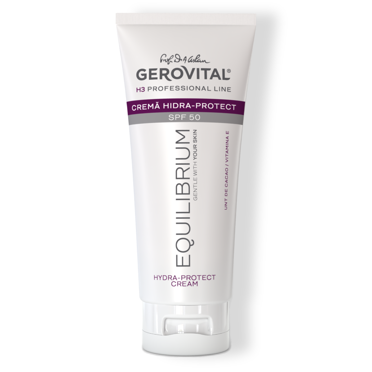 Gerovital® H3 Prof. Dr. Ana Aslan Equilibrium Cremă Hidra-Protect are o formulare uşoară de cremă gel, o textură hidratantă, fără efect gras, fără ulei mineral, cu emulgator natural ecocertificat, fără parabeni. Având un factor de protecţie ridicat şi principii active care îi conferă o bună toleranţă pe piele (Uleiul de Rodie, Untul de Cacao, Vitamina E) constituie un excelent mijloc de protecţie a tenurilor sensibile împotriva îmbătrânirii premature produse de radiaţiile solare şi poate fi folosită cu succes pentru prevenţ...