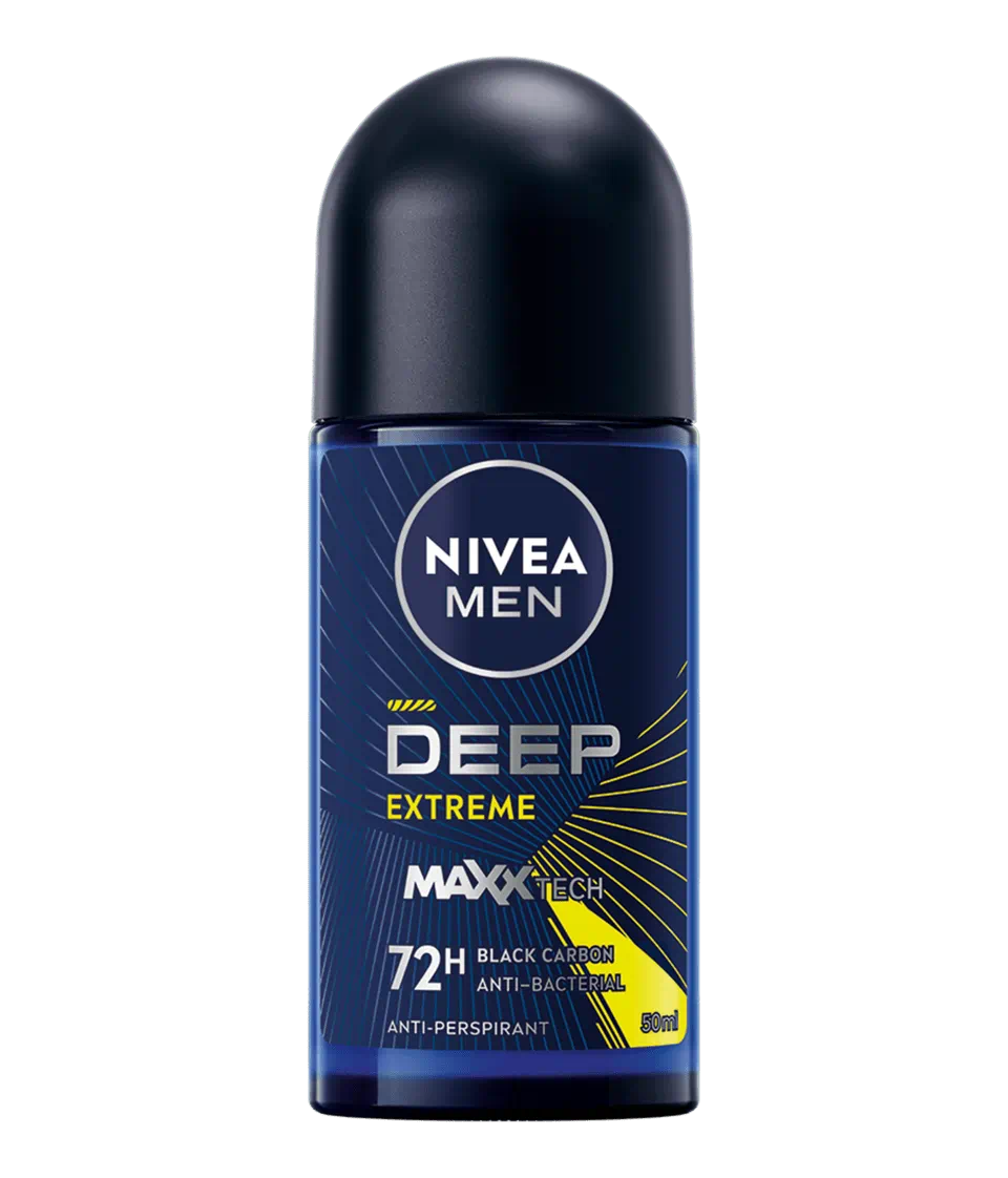 Nivea Men Deep Extreme roll-on oferă protectie antibacteriana cu tehnologia MaxxTech si carbon, 72h eficienta si parfum energizant pentru activitati sportive intense.