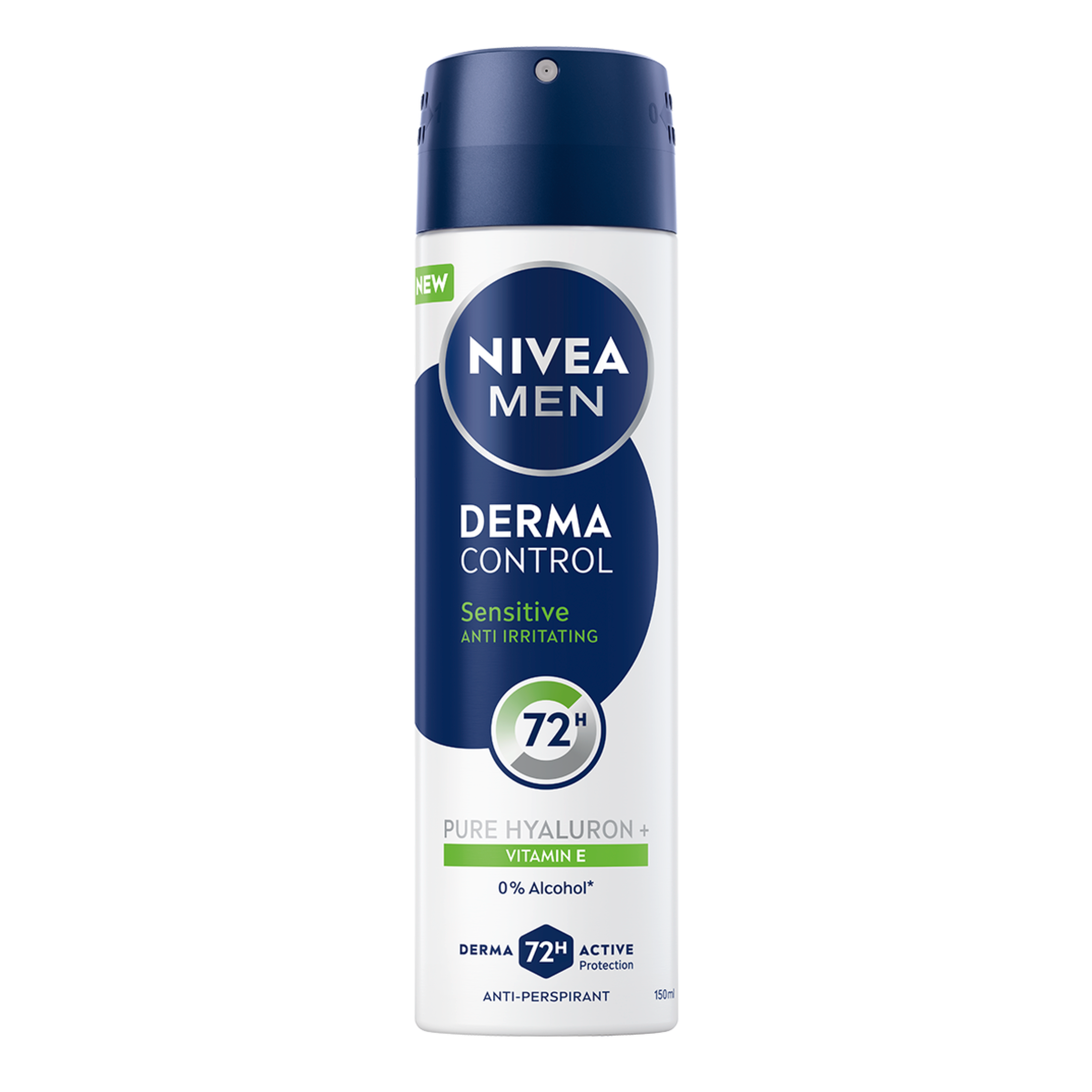 Deodorantul spray Derma Control Sensitive, 150ml, Nivea ofera protectie 72h, calmare pentru pielea sensibila si hidratare cu Acid Hialuronic si Vitamina E.