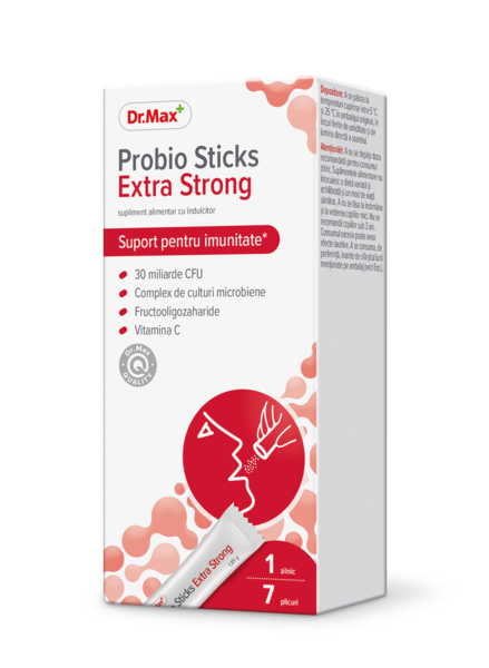 Dr.Max Probio Sticks Extra Strong este un supliment alimentar sub forma de plicuri cu probiotice, prebiotice si vitamina C, conceput pentru sustinerea florei intestinale si a sistemului imunitar.