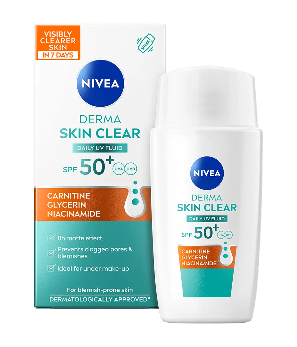 Nivea Derma Skin Clear Fluid SPF50+, 40ml, hidrateaza, matifiaza 8h si uniformizeaza tenul cu Niacinamide, Carnitina si Glicerina, fara a incarca porii.