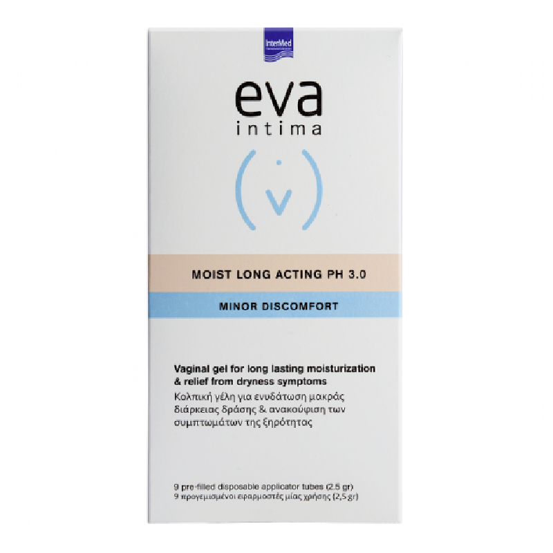 EVA INTIMA® MOIST LONG ACTING cu acid hialuronic si carbomer reface imediat si mentine pe termen lung umiditatea vaginala, ameliorand simptomele de uscaciune ale femeilor adulte si, in special, ale femeilor la menopauza.
