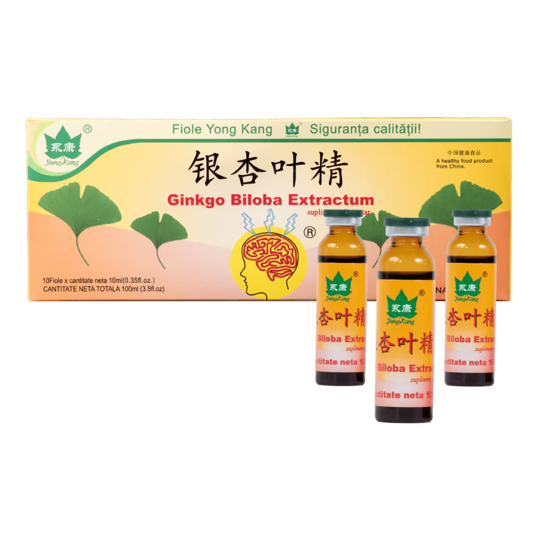Ginkgo Biloba & Ginseng Extractum, 10 fiole, Yongkang este un supliment alimentar ce combină extractele naturale de Ginkgo Biloba și Ginseng, recunoscute pentru efectele lor benefice asupra circulației, memoriei și nivelului de energie. Formula lichidă este ușor de administrat și contribuie la menținerea vitalității și a clarității mentale.