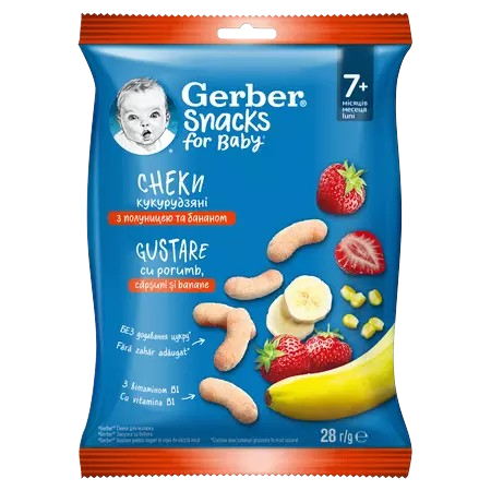 Gerber Snacks cu porumb, capsuni si banane este o gustare delicioasa si echilibrata, special creata pentru bebelusii cu varsta de peste 7 luni.