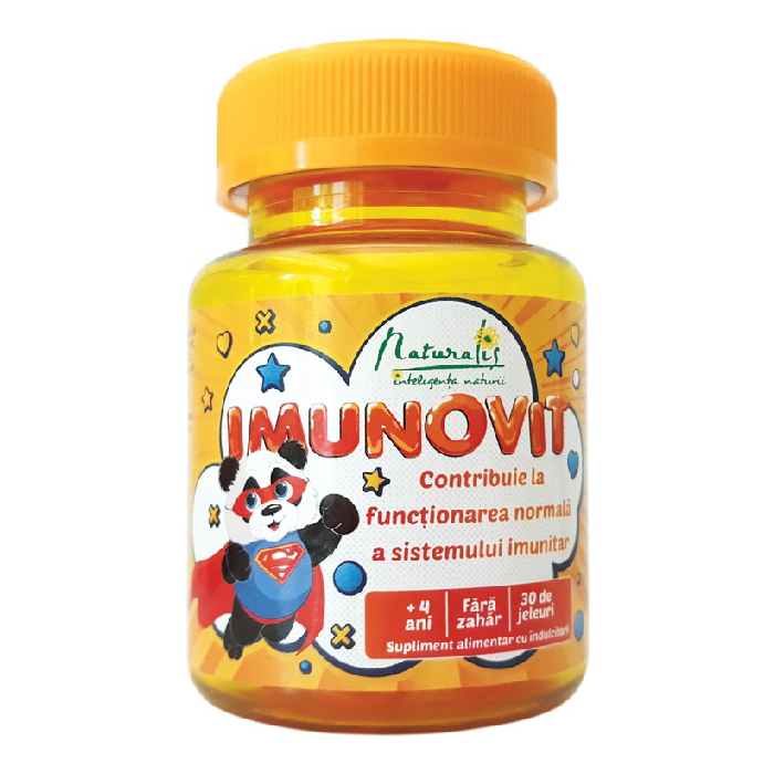 Pentru ce se utilizeaza Imunovit gummy, 30 jeleuri, NaturalisNaturalis Imunovit contribuie la functionarea normala a sistemului imunitar, datorita combinatiei de vitamina C si zinc. Organismul uman nu isi poate sintetiza singur vitamina C si, tocmai de aceea, trebuie sa si-o procure din alimente sau din suplimente alimentare.