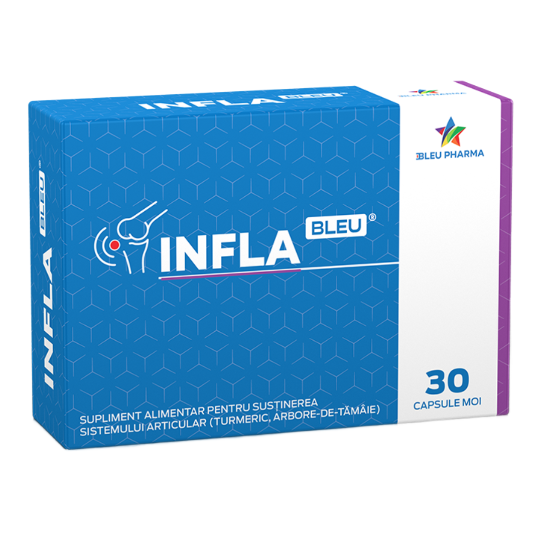 Infla Bleu este un supliment alimentar formulat pentru susținerea sănătății articulare și a mobilității. Conține extracte patentate și ingrediente cu rol antioxidant, menite să sprijine confortul articular, în special în perioade de solicitare fizică, în vârstă sau într-un stil de viață activ.
