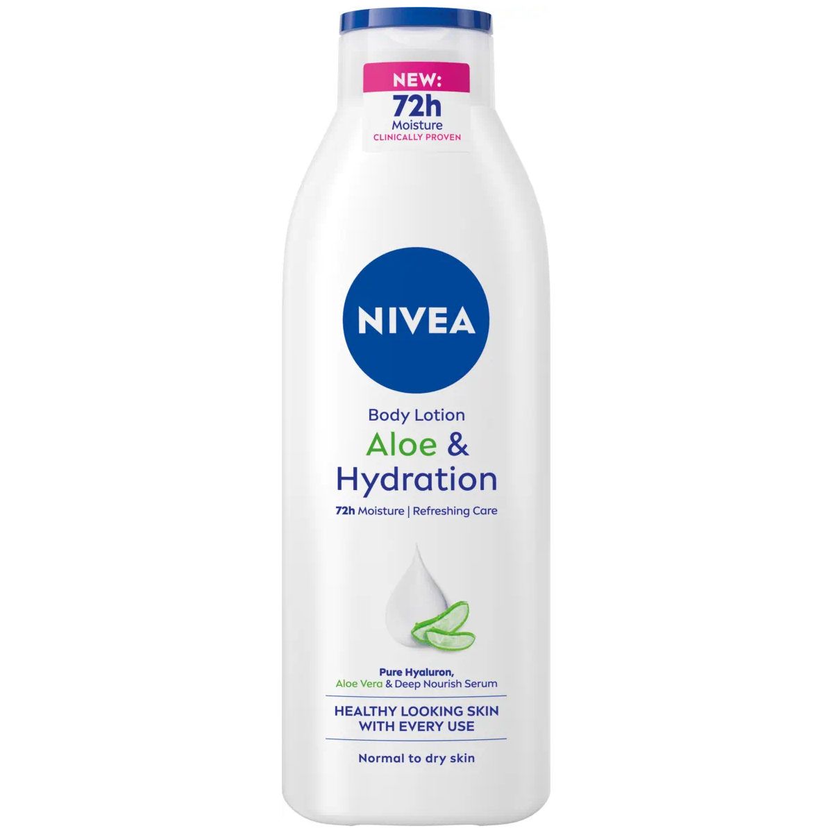 Lotiunea de corp hidratanta cu aloe vera Nivea hidrateaza, catifeleaza pielea si se absoarbe rapid.