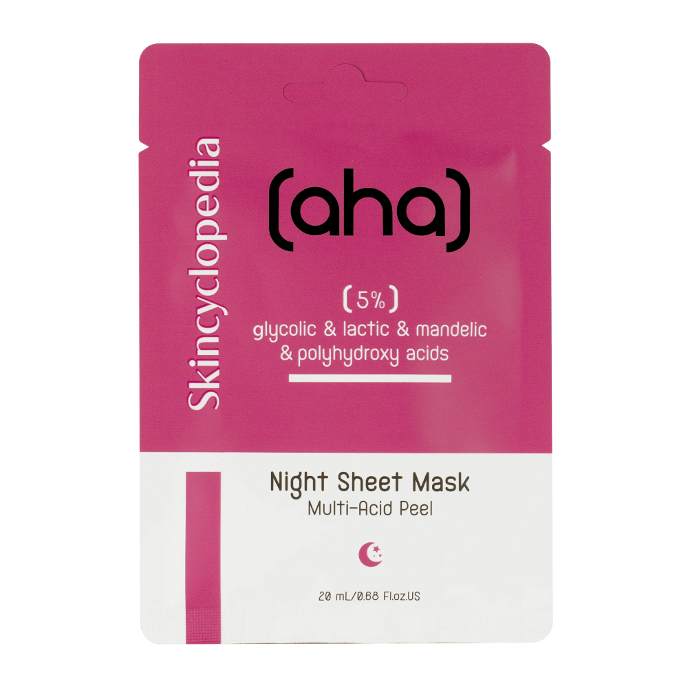 Masca faciala tip servetel Skincyclopedia AHA & PHA 5% este formulata pentru a sprijini regenerarea pielii pe timpul noptii, contribuind la reducerea semnelor vizibile de imbatranire, uniformizarea nuantei si estomparea petelor pigmentare.