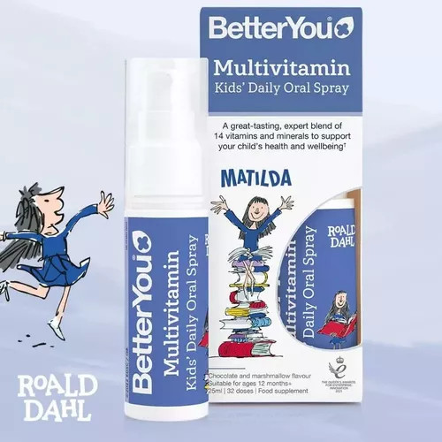 Multivitamin Kids Daily Oral Spray, 25 ml | BetterYou Flaconul contine necesarul pentru 32 doze zilnice (a cate 4 pulverizări pe zi), 25ml BetterYou Multivitamin Kids' Oral Spray este un spray cu administrare orală, cu gust deosebit, contine un amestec de 14 vitamine si minerale esentiale, care actionează in sinergie pentru a oferi un suport nutritional complet pentru sănătatea si bunăstarea copilului dumneavoastră. Immune Health Kids Oral Spray este potrivit pentru copiii in varstă de 1 an si peste. Tehnologia de pulverizare intra-orală Spray-urile orale BetterYou au fost formulate pentru a oferi o nutritie optimă, astfel fiecare pulverizare asigură ingredientul activ in picături de dimensiuni mici care pătrund in tesutul moale al obrazului, furnizand substantele nutritive esentiale intr-o zonă bogat vascularizată. Acest lucru permite ca ingredientul să intre rapid in fluxul sanguin pentru o absorbtie optimă. Avantaje Multivitamin Kids' Oral Spray: 14 vitamine si minerale esentiale administrare usoară potrivit de la 12 luni+ aromă de ciocolată si bezea 32 doze zilnice fabricat din ambalaje 100% reciclabile fără ulei de palmier si derivati Ingrediente active / doza zilnică (4 pulverizări): Vitamina B12 – 3 µg 120% VNR* Vitamina D3 – 400 UI (10 μg) 200% VNR* Acid Folic – 200 μg 100% VNR* Seleniu– 38 μg 68% VNR* Vitamina B1– 0.28 mg 25% VNR* Vitamina B2 – 0.53 mg 38% VNR* Vitamina K1– 38 μg 50% VNR* Vitamina B7 (Biotină) – 25 μg 50% VNR* Iod– 75 μg 50% VNR* Vitamina B5 (Acid pantotenic) – 2.25 mg 38% VNR* Vitamina B6– 0.6 mg 43% VNR* Vitamina B3 (Niacină) – 4 mg 25% VNR* Vitamina C– 10 mg 12.5% VNR* Vitamina A– 300 UI (90 μg) 11.25% VNR* *Valoarea nutriţională de referinţă conform regulamentului 1169/2011 Doză recomandată: Copii incepand cu varsta de 1 an: 4 pulverizări pe zi administrate odată sau separate Mod de administrare: La prima utilizare apăsati pompita de 3 ori pană lichidul incepe să fie expulzat. Agitati inainte de fiecare utilizare. Actionati pompita cu atentie in gura copilului, preferabil pe partea interioară a obrajilor si mentineti cateva secunde. Puneti capacul după utilizare. Flaconul contine necesarul pentru 32 doze zilnice (a cate 4 pulverizări pe zi). Consumati produsul in 6 luni de la prima utilizare. Atentie! A nu se lăsa la indemana şi la vederea copiilor mici. A se păstra in ambalajul original, la loc uscat, ferit de razele soarelui. Suplimentele alimentare nu inlocuiesc o dietă variată şi echilibrată şi un mod de viaţă sănătos. A nu se depăşi doza recomandată zilnic. Contine xilitol – consumul excesiv poate produce efecte laxative.
