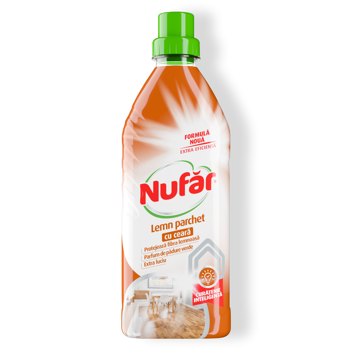 Nufăr Lemn-Parchet cu Ceară  revitalizează pardoselile din lemn masiv și parchet laminat, oferind un extra luciu. Formula sa inovatoare curăță eficient murdăria și protejează fibra lemnoasă, păstrându-i frumusețea. Parfumul proaspăt de pădure verde adaugă o notă naturală.   Recomandat pentru: parchet din lemn masiv, parchet laminat, mobilier din lemn/ pal, uși, rame, alte suprafețe din lemn....