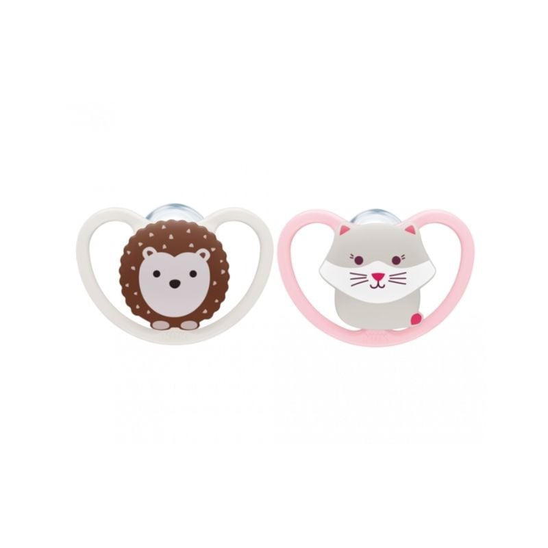 Multumita design-ului unic, Suzeta Space NUK nu este doar blanda cu pielea copilului, ci arata si foarte atragator. Acum este disponibila in mai multe tematici. Bineinteles, tetina Suzetei Space NUK are forma originala NUK, realizata dupa modelul mamelonului mamei ce alapteaza. Aceasta inseamna ca Suzetele NUK contribuie la dezvoltarea orala, sunt acceptate de 95% dintre copii** si nu creeaza confuzie cu mamelonul.**Tetina este atat de plata, de subtire si de ingusta incat se potriveste perfect in gura si ofera limbii, dar si maxilarului, indeajuns spatiu pentru miscari naturale. Fapt confirmat de moase, pediatri si ortodonti**, dar si de mame***. Forma anatomica corecta NUK este ideala deoarece prin sugere nu este asigurat doar aportul de hrana, ci s-a demonstrat ca astfel se dezvolta abilitati importante, cum ar fi modalitatea corecta de inghitire, de mestecare si, ulterior, de vorbire.