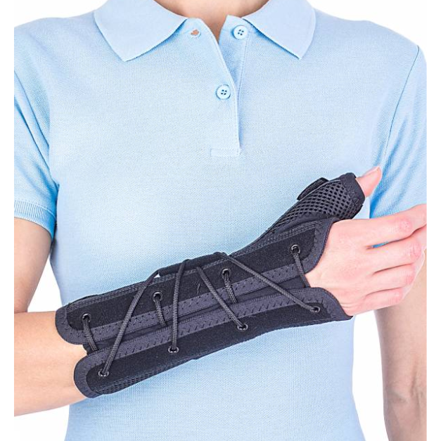 Orteza incheietura mainii cu fixare deget SRT230 ofera suport stabil si imobilizare eficienta in caz de entorse, luxatii, sindrom de tunel carpian, artroze, fracturi sau paralizia nervului radial. Prevazuta cu atele metalice modelabile si sistem de inchidere cu siret si scai, orteza stabilizeaza articulatia radiocarpiana si policele, reducand durerea si accelerand recuperarea.