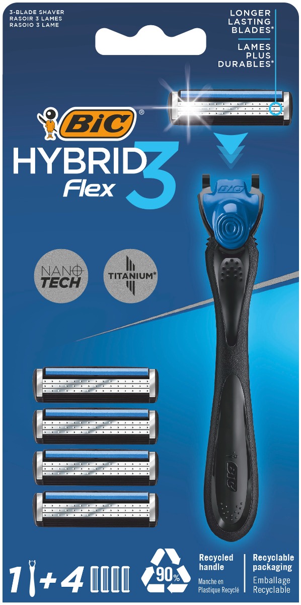 Pachetul BIC Flex 3 Hybrid include 1 aparat de ras reutilizabil si 3 rezerve cu lame triple nano-tech din titan, cap pivotant si banda lubrifianta cu Aloe Vera si vitamina E, pentru un barbierit precis, delicat si confortabil.