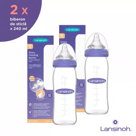 Pachet biberoane din sticla, 2 x 240 ml, Lansinoh Descriere produs Laptele matern ramane cea mai buna alegere pentru dezvoltarea sanatoasa a bebelusului. Biberoanele din sticla Lansinoh sunt create pentru a sprijini o hranire naturala, sigura si confortabila, fiind ideale pentru parintii care doresc o tranzitie usoara intre san si biberon. Tetinele NaturalWave cu flux mediu incurajeaza miscarile peristaltice naturale ale limbii bebelusului si reduc riscul de confuzie intre san si biberon. Caracteristici Fabricate din sticla premium , 100% reciclabila si rezistenta la socuri termice Tetina NaturalWave , moale si flexibila, din silicon sigur pentru bebelusi Sistem AVS™ de ventilatie – reduce aerul inghitit si previne colicile Margini interioare verticale ce mentin forma tetinei Baza texturata pentru o prindere sigura si o hranire eficienta Fara BPA si BPS Compatibile cu intreaga gama Lansinoh Dovedit clinic ca reduce preferinta pentru mamelon Usor de asamblat si curatat Instructiuni de utilizare Se recomanda introducerea biberonului dupa 6–8 saptamani de alaptare, la indicatia medicului pediatru sau a consilierului in alaptare. Hraniti bebelusul respectand ritmul sau natural, pentru a evita hranirea excesiva. Curatare si sterilizare Spalati imediat dupa utilizare cu apa fierbinte si detergent de vase. Daca nu este posibil, utilizati o perie speciala pentru biberoane. Sterilizati inainte de fiecare folosire pentru siguranta maxima. Beneficii ✔ Sustine hranirea naturala, asemanatoare alaptarii ✔ Ajuta la reducerea colicilor si disconfortului abdominal ✔ Asigura o hranire lina si controlata ✔ Materiale sigure, fara chimicale daunatoare Continut pachet 2 biberoane din sticla de 240 ml 2 tetine cu flux mediu 2 inele de infiletare 2 capace de protectie