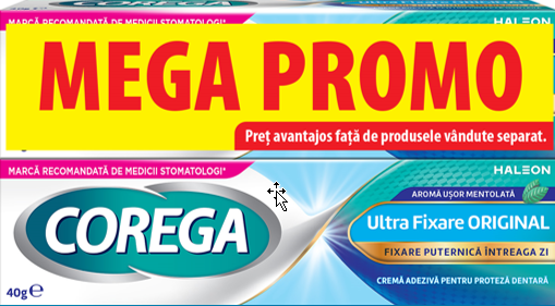 Acest produs Pachet Crema adeziva pentru proteza ultra fixare Original+ 75% reducere la al doilea produs, 2 x 40g, Corega din categoria Frumusete si ingrijire se poate comanda online la un pret redus.
