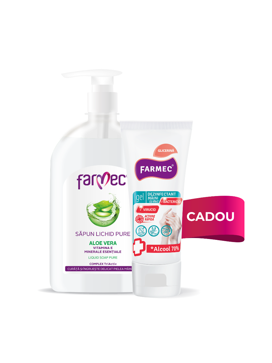 Pachetul promo conține: 1 x Săpun Lichid Pure Aloe Vera 500 ml 1 x CADOU Gel Dezinfectant Mâini cu Alcool 70% și Glicerină 50 ml ...