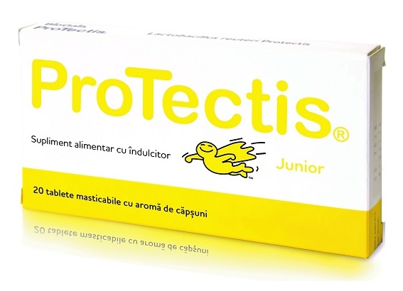 Acest produs Protectis Junior cu aroma de capsuni, 20 comprimate, BioGaia din categoria Suplimente alimentare se poate comanda online la un pret redus.