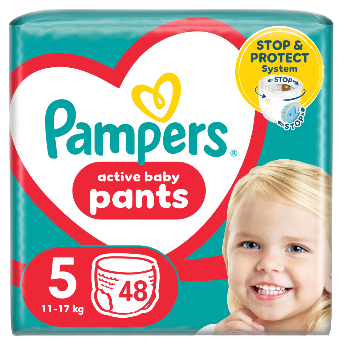 Scutecele-chilotel Pampers Active Baby Marimea 5 (11–17 kg), ofera protectie superioara impotriva scurgerilor si confort complet pentru bebelusii activi. Cu sistemul inovator Stop & Protect si designul cu talie flexibila 360°, asigura libertate de miscare si pana la 12 ore de protectie uscata.