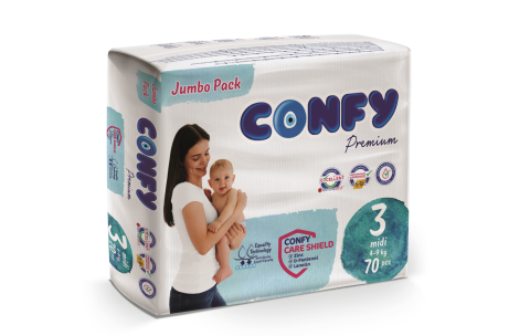 Acest produs Scutece copii pentru 4 - 9kg Nr.3 Premium Midi Jumbo, 70 bucati, Confy din categoria Mama si copilul se poate comanda online la un pret redus.