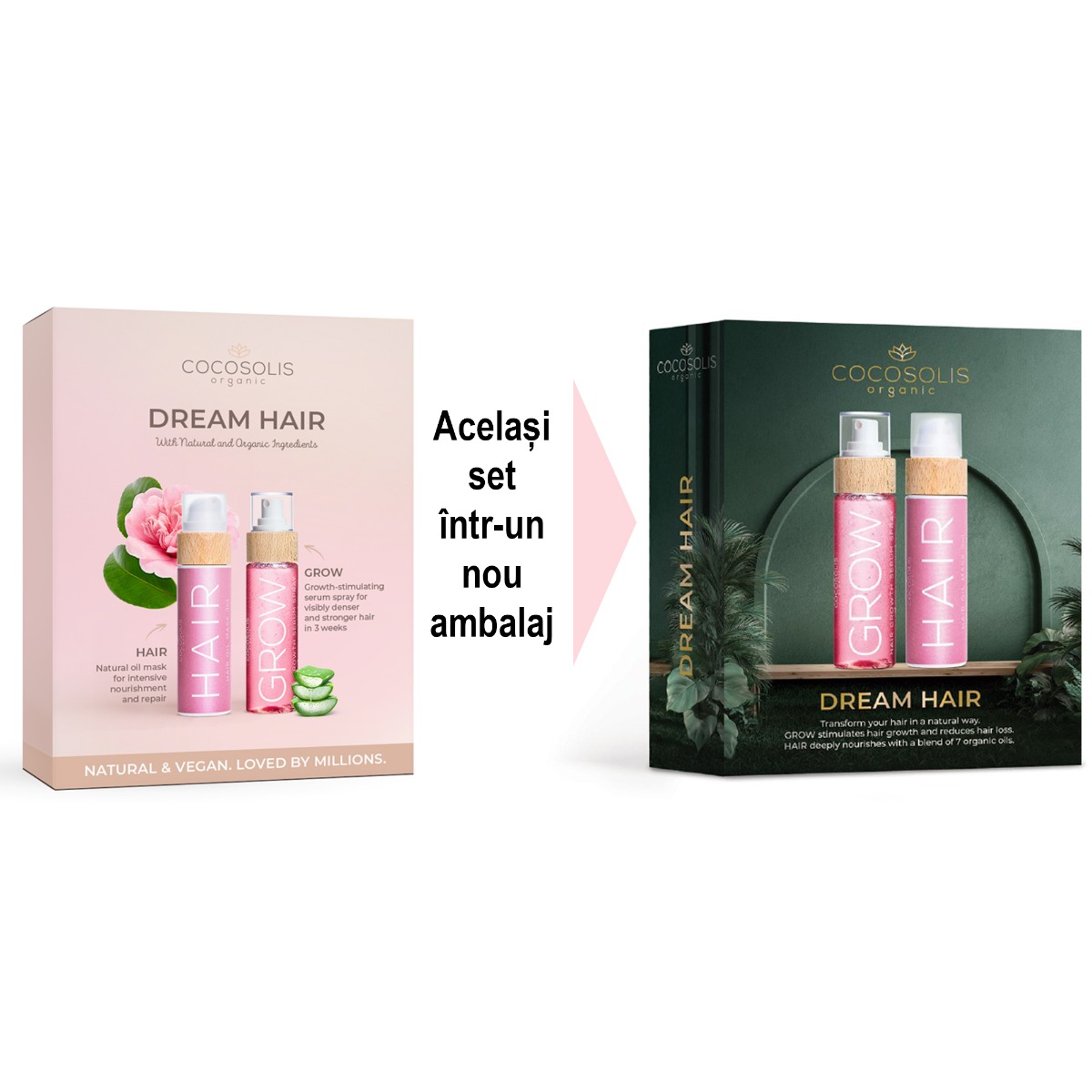 Set Dream Hair, Cocosolis – combinatie de produse naturale pentru par: ulei 3 in 1 Hair Oil Mask, 110ml si ser Grow Hair Growth Spray, 110ml. Hraneste, repara si stimuleaza cresterea parului, oferindu-i vitalitate si stralucire.