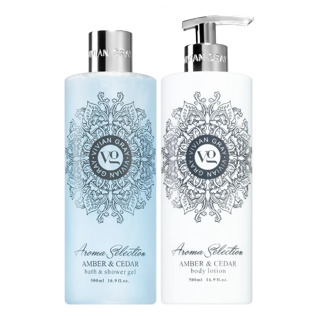 Setul include gelul de duș Vivian Gray Aroma Selection Amber & Cedar și loțiunea de corp asortată, oferind un ritual de îngrijire complet.