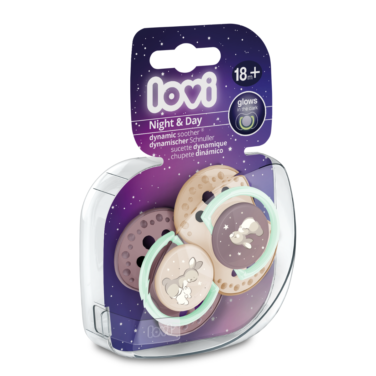 Set de suzete din silicon LOVI Dynamic Night&Day Girl, pentru copii 18+ luni, concepute pentru a proteja reflexul natural de supt si a sustine dezvoltarea corecta a vorbirii.
