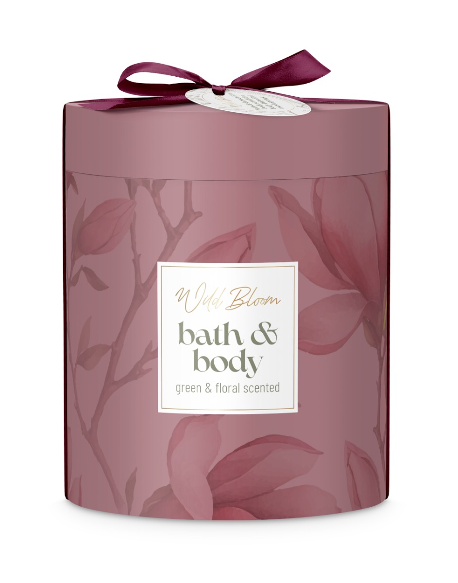 Set cadou cu gel de dus, exfoliant, lotiune de corp si burete tip sita, ideal pentru relaxare si ingrijire completa. Prezentare eleganta Wild Bloom, Treffina.