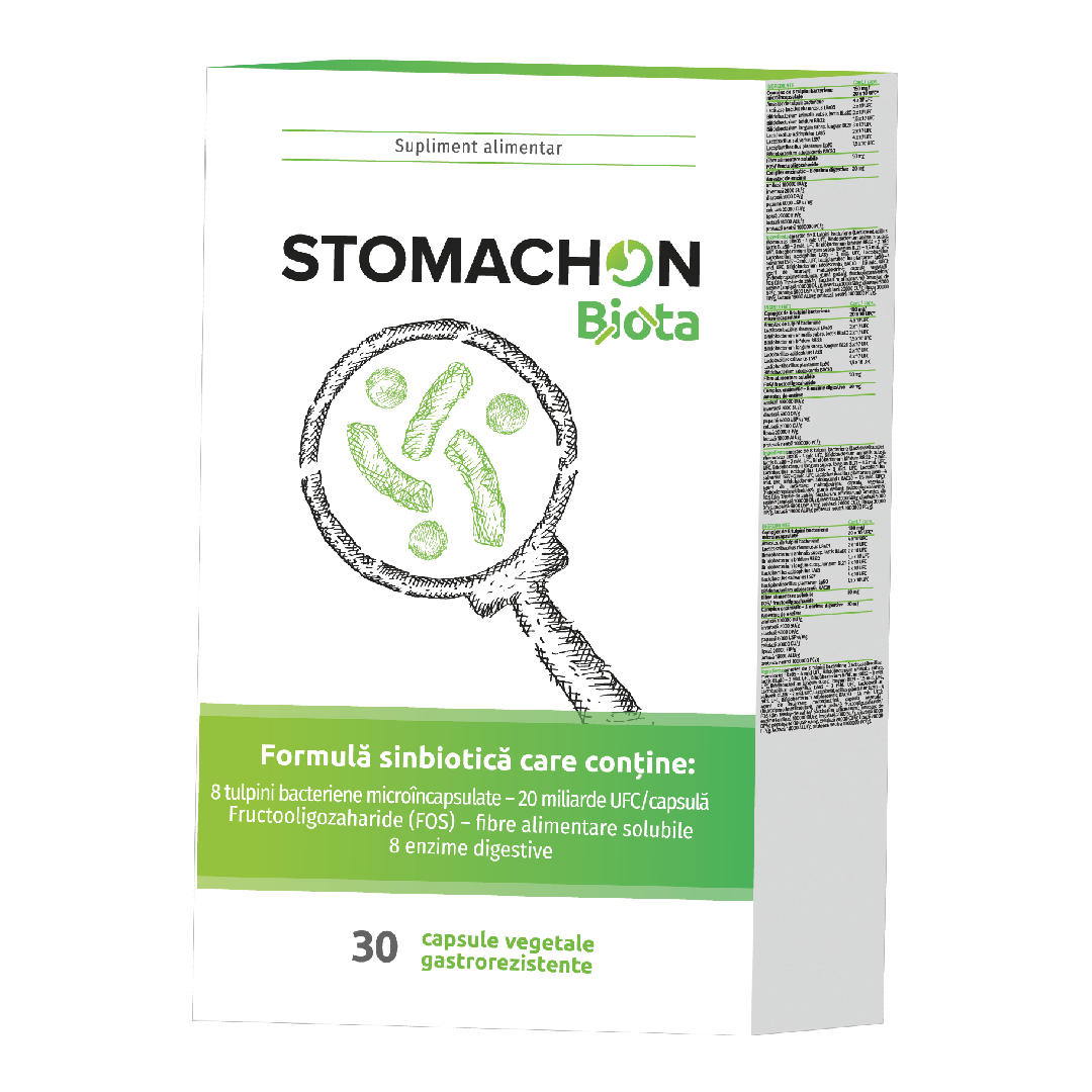 STOMACHON BIOTA® este un supliment alimentar sinbiotic cu 8 tulpini probiotice, prebiotic (FOS) și 8 enzime digestive, formulat în capsule vegetale gastrorezistente. Conceput pentru susținerea digestiei naturale și echilibrul microbiotei intestinale, potrivit pentru adulți și copii peste 6 ani.