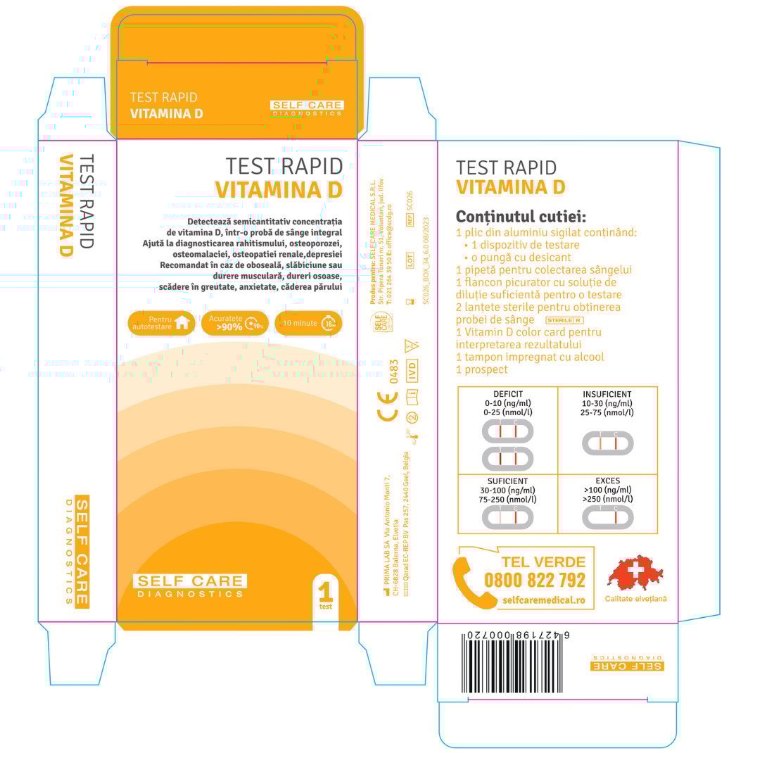 Test rapid Vitamina D, Self Care - este un test imunologic, semicantitativ, care determina in 10 minute concentratia de 25-OH-Vitamina D (D2+D3) dintr-o picatura de sange.