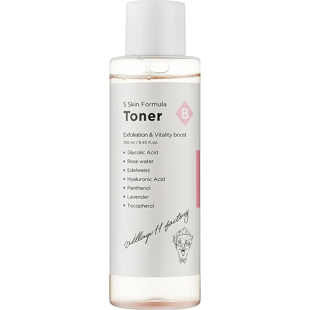 Toner facial Village 11 Factory B Skin Formula – cu AHA, acid hialuronic si extract de trandafir, exfoliaza bland, hidrateaza si netezeste pielea, restabilind echilibrul pH-ului.