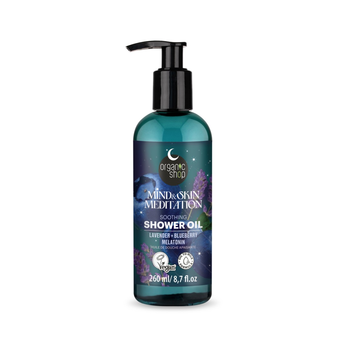 Uleiul de dus Mind&Skin Meditation de la Organic Shop curata delicat si hidrateaza intens pielea, inducand relaxare si pregatind corpul pentru un somn linistit.