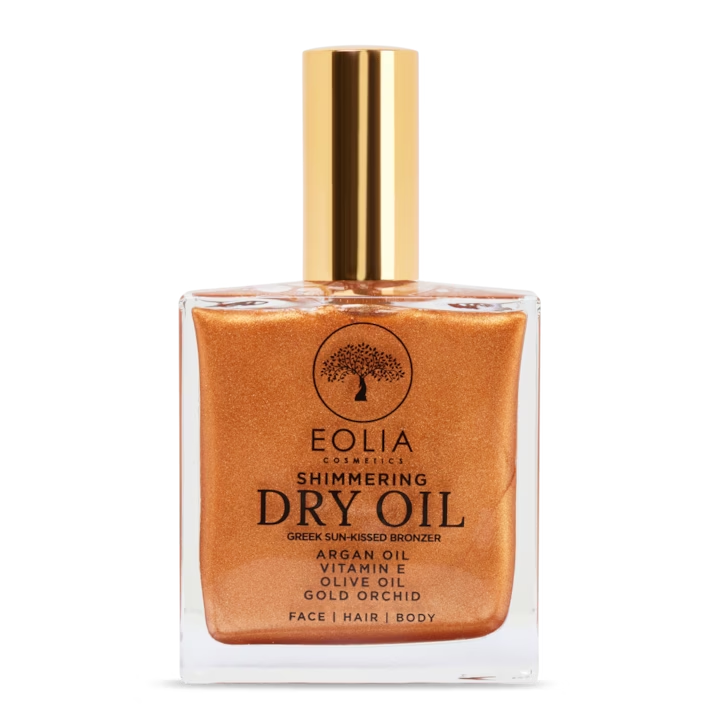 Ulei uscat organic cu sclipici fin si parfum de orhidee, imbogatit cu ulei de argan, ulei de masline si vitamina E, pentru hidratare, luminozitate si catifelare.