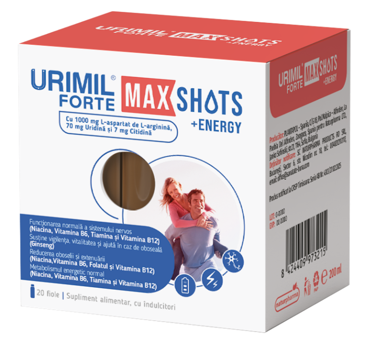 Urimil Forte Max Shots + Energy este un supliment alimentar sub forma de fiole buvabile, pentru o utilizare rapida si usoara si o absorbtie mai rapida a nutrientilor, care contine o concentratie mare de uridina si citidina.