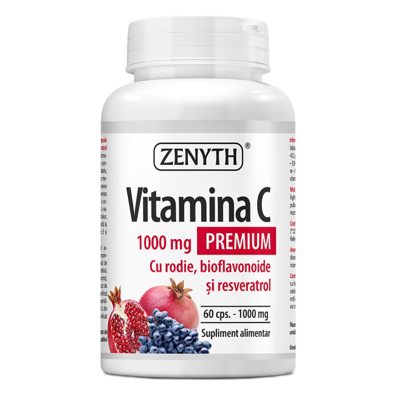 Vitamina C: Aliatul tău pentru o imunitate de fier!Cele două produse Vitamina C Premium de la Zenyth conțin nutrienți cu acțiune sinergică: acid ascorbic natural + co-factori (bioflavonoide, resveratrol). Datorită co-factorilor naturali, asimilarea și biodisponibilitatea Vitaminei C din aceste două suplimente sunt ridicate.1000 mg Vitamina C/capsulă*!*800% din doza zilnică recomandată.90% bioflavonoide exprimate în hesperidină: acesta este conținutul de bioflavonoide din extractul standardizat din portocală dulce folosit în Vitamina C Premium de la Zenyth!Bioflavonoidele cresc biodisponibilitatea Vitaminei C!Bioflavonoidele fac parte dintr-o mare clasă de nutrienți ce sunt prezenți mai ales în coaja fructelor și legumelor roșii. Ajunse în corp, bioflavonoidele:Potențează acțiunea vitaminei C contribuind la absorbția acesteia în organism.Apără corpul de agenții externi dăunători.Au efect antioxidant, antiinflamator și antibacterian.Cresc rezistența capilarelor și reglează permeabilitatea acestora, prevenind formarea varicelor și hemoroizilor.Contribuie la funcționarea normală a sistemului circulator și cardiovascular.Mențin elasticitatea pielii și previn îmbătrânirea.Citricele: sursă naturală de Vitamina C și bioflavonoide!Citricele se numără printre fructele cu cel mai mare conținut de Vitamina C, au un puternic efect antioxidant, sunt bogate în fibre, contribuie la absorbția fierului în sânge și ajută organismul să producă celule roșii.Rodia conține o cantitate uriașă de antioxidanți și vitamina C!Rodia previne îmbătrânirea, protejează rinichii, inima, scade colesterolul rău și îl crește pe cel bun, contribuie la regenerarea ficatului, la reglarea glicemiei și a tensiunii arteriale. Are un conținut bogat în polifenoli ce te pot apăra de alergii, iar studiile efectuate au demonstrat că rodia poate reduce semnificativ deteriorarea celulelor creierului, mușchilor și pielii.Resveratrolul: soluție eficientă anti-îmbătrânire!Resveratrolul este un bioflavonoid antioxidant ce se găsește în coaja strugurilor. Studiile efectuate au demonstrat că resveratrolul este capabil să crească durata de viață a celulelor, are efect antiîmbătrânire, este antiinflamator și menține sănătatea inimii, a mușchilor și creierului.Bucură-te de mai multă sănătate cu doar o capsulă de Vitamina C pe zi!Vitamina C cu citrice și bioflavonoide și Vitamina C cu rodie, bioflavonoide și resveratrol sub formă de capsule sunt ușor de administrat, nu conțin îndulcitori artificiali sau aditivi chimici!IngredienteIngrediente/capsulă Vitamina C cu rodie, bioflavonoide și resveratrol: Vitamina C/acid ascorbic–1000 mg; pulbere din suc concentrat de rodie (Punica Granatum), în bază de maltodextrină – 221,5 mg; extract de Morcov-purpuriu (Daucus carota), în bază de maltodextrină – 65 mg; extract de portocală dulce (Citrus sinensis), standardizat la 90% bioflavonoide exprimate în hesperidină – 55,5 mg; extract hidroetanolic 200:1 din pielițe de struguri (Vitis vinifera), standardizat în 50% trans-resveratrol – 8 mg; capsulă din gelatină.Conținut de vitamina C / capsulă: 1000 mg* (*800% din VNR – Valoarea Nutrițională de Referință conform Regulament 1169/2011).Nu conține lactoză, gluten, soia, stearat de magneziu, îndulcitori artificiali sau aditivi chimici!Mod de administrareDoza uzuală: Adulți – o capsulă pe zi, înghițită ca atare sau desfăcută și dizolvată pulberea în apă.A se administra în timpul zilei sau conform recomandării specialistului.O capsulă conține 1000 mg Vitamina C* (*800% doza zilnică recomandată).