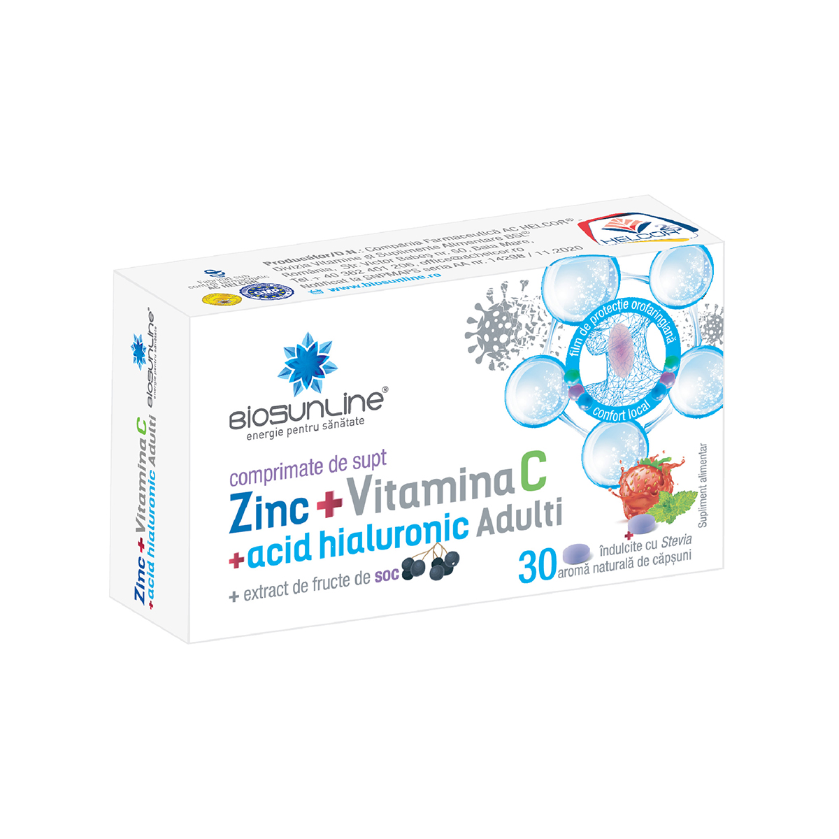 Acest produs Zinc + Vitamina C + Acid Hialuronic pentru adulti, 30 comprimate de supt, BioSunLine din categoria Suplimente alimentare se poate comanda online la un pret redus.